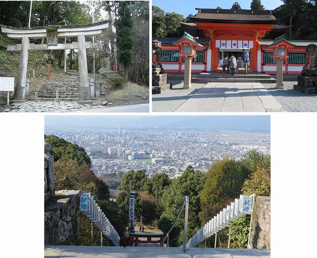(左: 高良大社の麓の鳥居、右: 拝殿、下: 大社からの眺望)