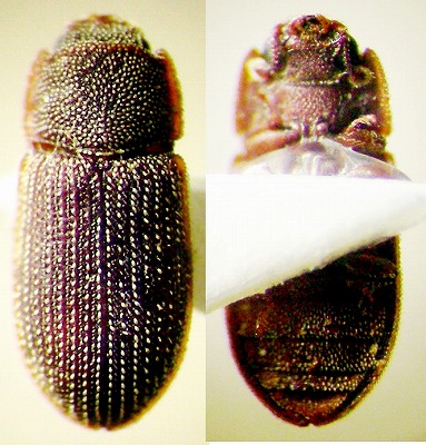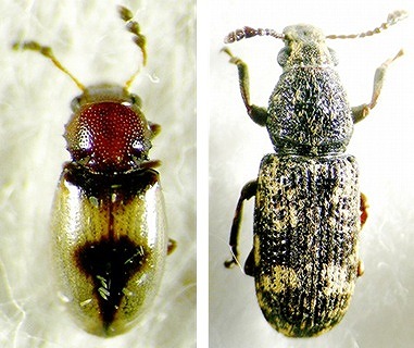 (左から、カドムネチビヒラタムシ、カシノナガキクイムシ)