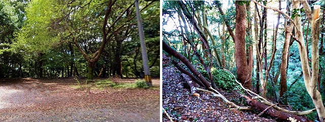 (B地点、左から、白幕を張った道横の広場、その下の斜面の林内)