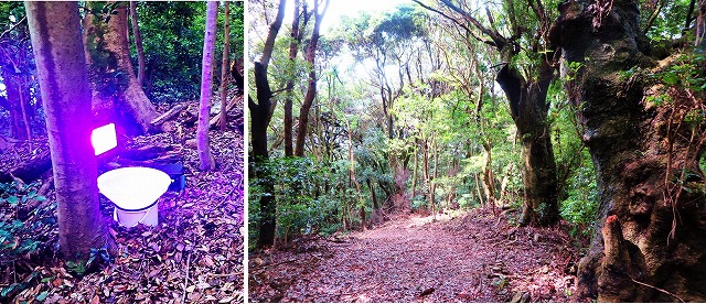 (C地点、左から、ブラックライトBox設置、林内・一抱え以上の大木が見える)