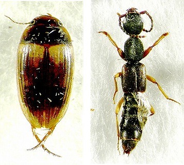 (左から、カンムリセスジゲンゴロウ、コマルズハネカクシの近似種)