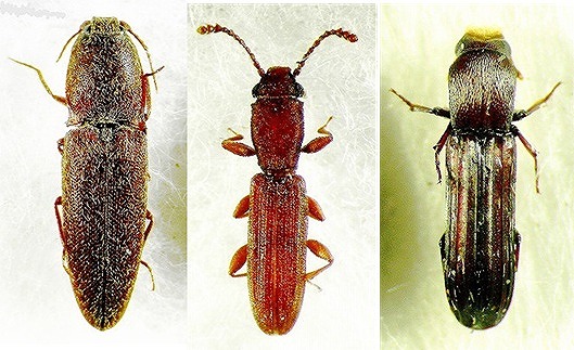 (左から、コガタノサビコメツキ、ヒラムネホソヒラタムシ、ヒュウガホソカタムシ)