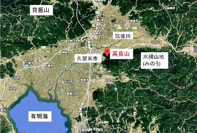筑後川の南側に、屏風のように聳える水縄山地(最高地点・鷹取山801m)の、西端の山(ピーク)で標高312m、山頂直下に筑後一の宮である高良大社が鎮座し、筑後平野全域が眺望できます。