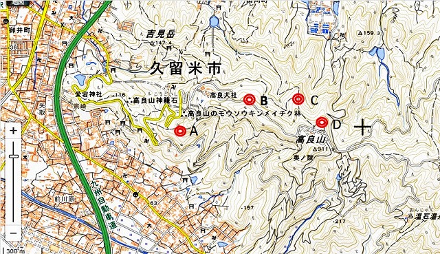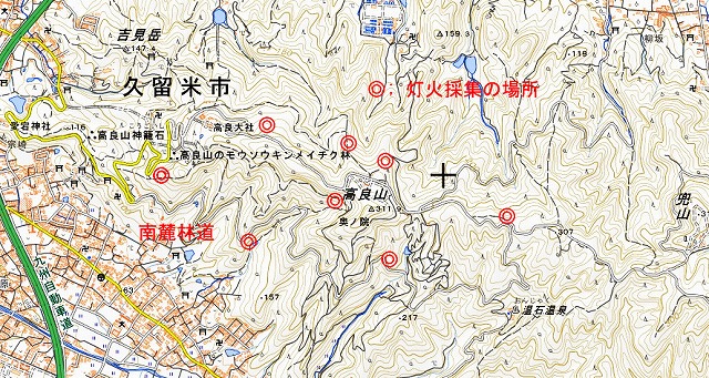 一応、高良山の範囲としては、山麓の鳥居の位置から、耳納スカイライン沿いの兜山まで、南麓林道沿いも含んでいます。