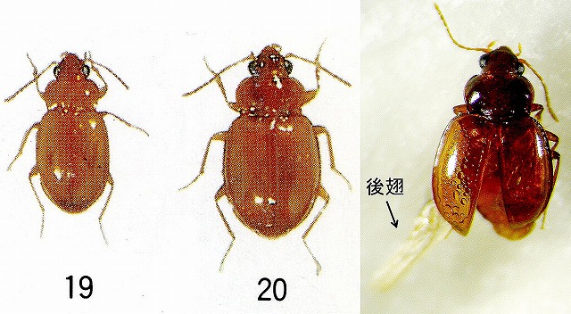(左から、甲虫図鑑IIから改変引用、19はキイロマル、20はセダカ、後翅を伸ばした高良山産セダカ)