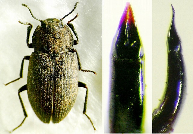 (左から、シナスナゴミムシダマシ背面、♂交尾器背面・側面・筑後川産今坂採集分)