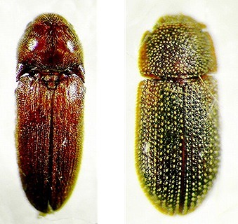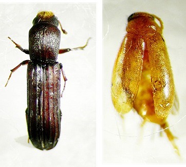 (左から、有馬さん採集の、ヒメムネミゾコメツキダマシ、ヒメヒラタホソカタムシの一種)