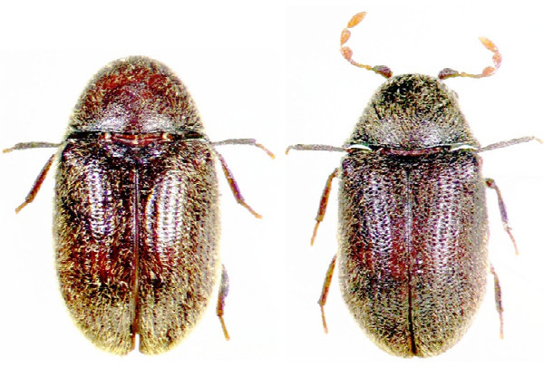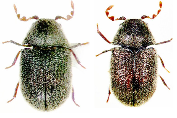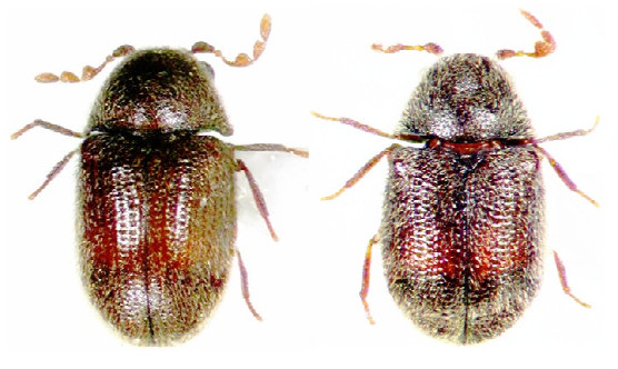 (左から、ヒュウガホソカタムシ、ヒメハナノミダマシ)
