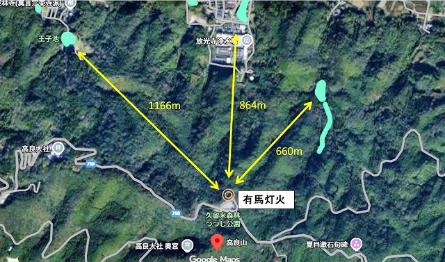 有馬さんの灯火から、地図上で最も近いのは660m位置に池のマークがあり、その上の谷には小渓流があるようです。その他、真北・864mの所には水源地の池が、北西1166mの所にも池があります。