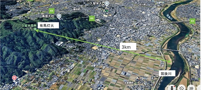 (筑後川と有馬さんの灯火の位置、グーグルアースより改変引用)