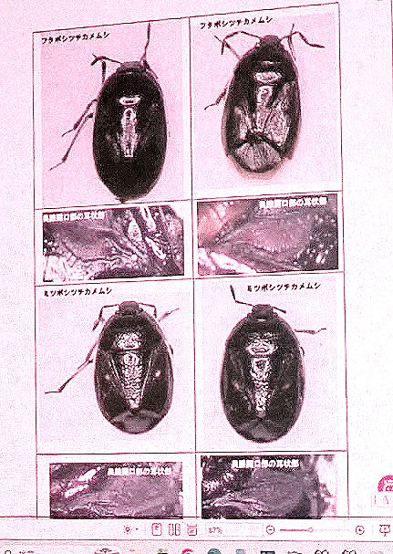 彼も、わざわざ、画像を用意して来られたようで、ミツボシツチカメムシとフタボシツチカメムシの区別について、図版を示して話をされました。